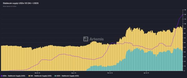 Lancé en novembre 2023, le stablecoin USDe représente désormais environ 4,6 % de parts de marché des stablecoins, en termes de capitalisation. À titre de comparaison, le DAI et l'USDS réunis (le DAI étant progressivement transféré en USDS) représentent 3,75 % de parts de marché.