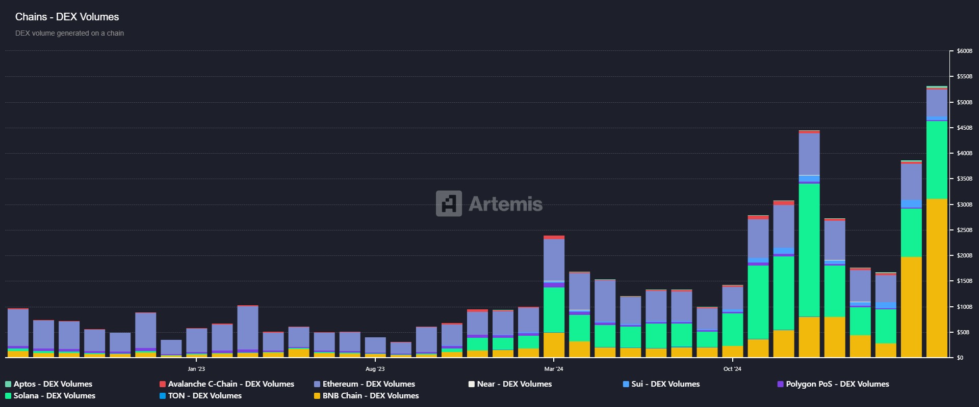 En effet, la BNB Chain vient de battre un record - toutes blockchains confondues - en enregistrant 311,6 milliards de dollars de volumes sur ses exchanges décentralisés (DEX) en 1 mois :
