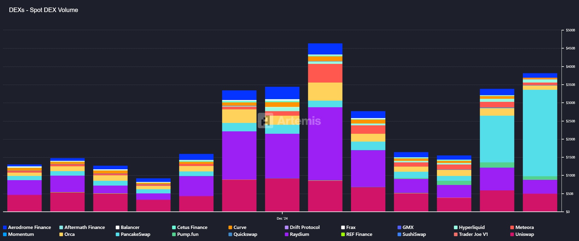 Même la blockchain Solana, pourtant au centre de l'engouement autour des memecoins en janvier dernier, n'avait atteint « qu'environ » 260 milliards de dollars de volumes sur ses DEX.