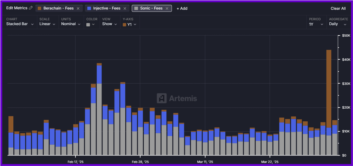 Graphique représentant les frais des blockchains Berachain (en marron), Injective (en bleu) et Sonic (en gris), en données journalières