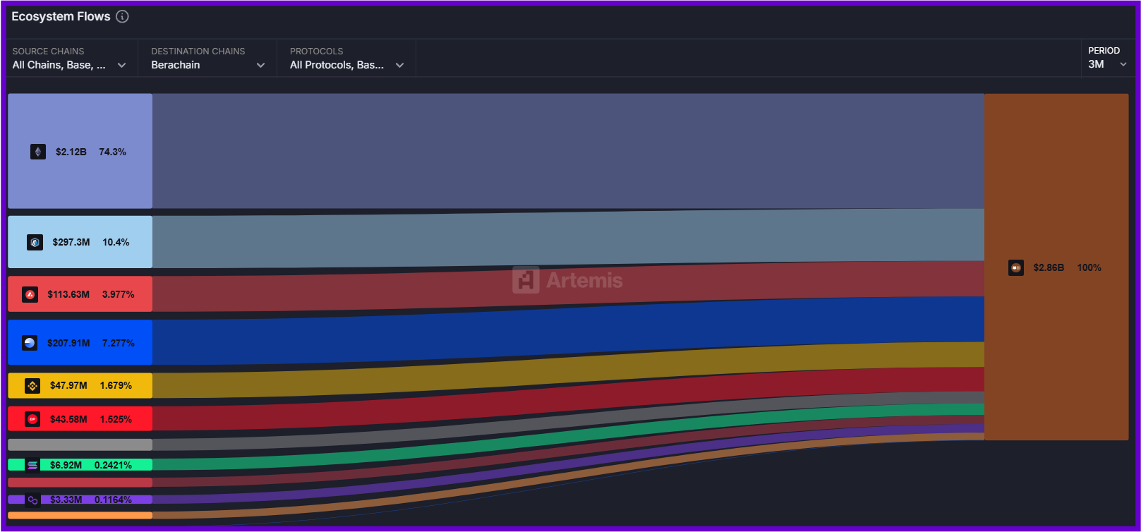 Nous l'exposions à l'instant, Berachain attire d'importantes liquidités sur son réseau. Comme nous pouvons le constater sur le graphique ci-dessous, 2,86 milliards de dollars ont afflué vers Berachain depuis son lancement.