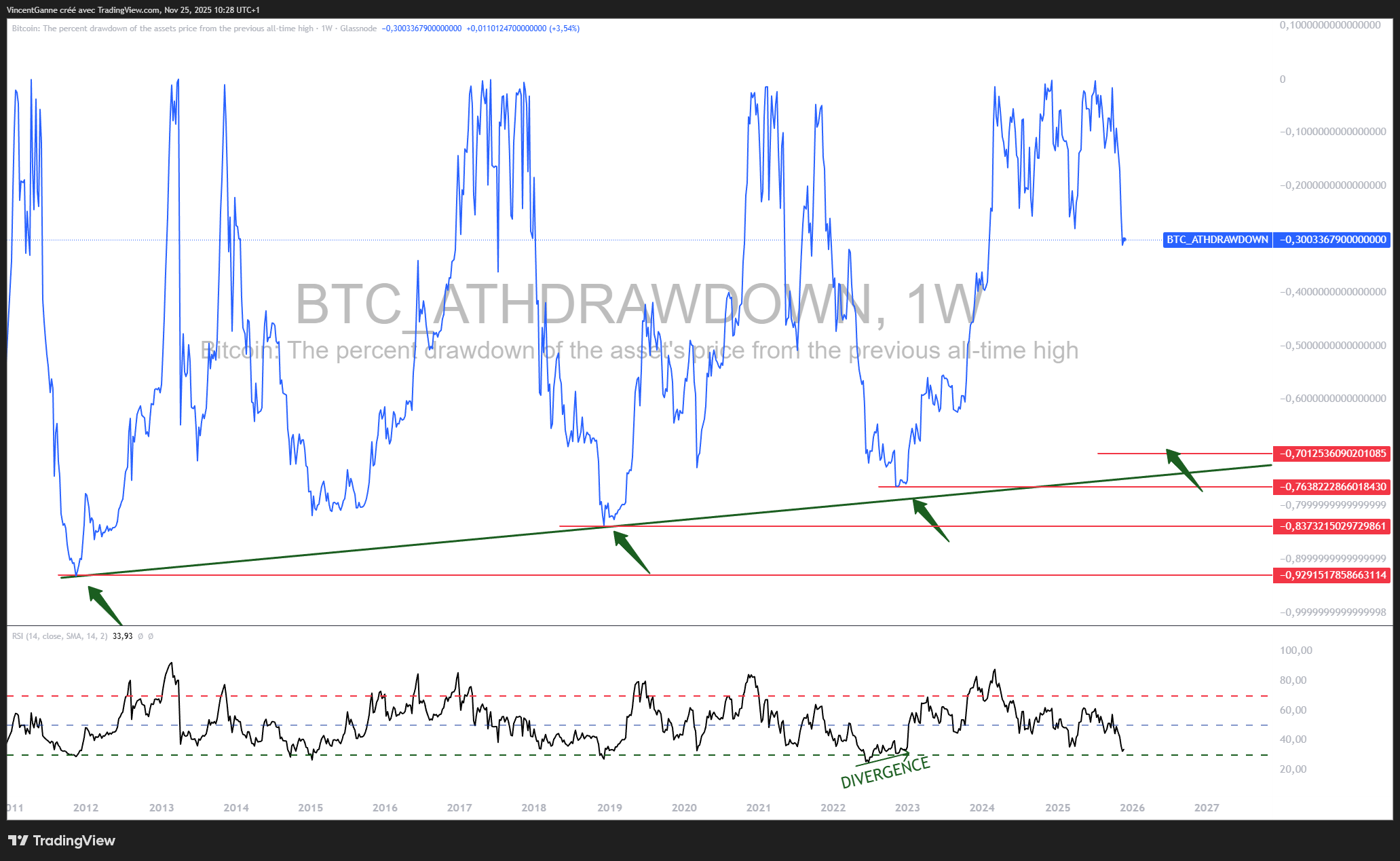 - Même si l’intensité des baisses tend à diminuer au fil des années, le drawdown reste historiquement important. Il faut le traiter comme une correction majeure, non comme une simple respiration du marché et ce dernier pourrait atteindre 50% sur ce nouveau bear market.