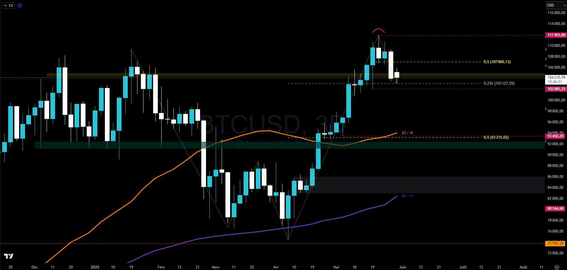 Ce record s'établit désormais à 104 600 dollars, niveau qu'il faudra surveiller au cours du mois de juin, tout comme le retracement 50 % de la bougie de mai autour de 102 000 dollars.