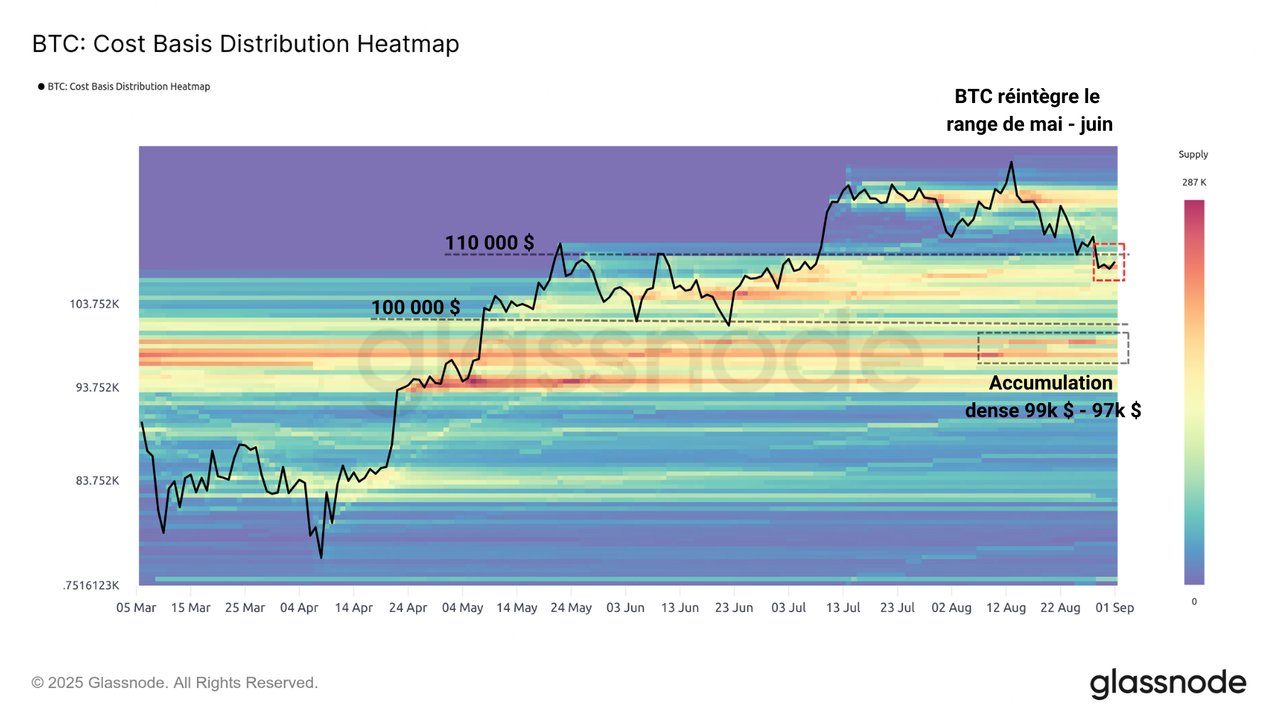 Après une poussée avortée au-dessus des 120 000 dollars, le prix du BTC a entamé sa baisse, réintégrant le range de mai-juin, situé entre 100 000 et 110 000 dollars. Cette fourchette de prix représente une zone d'accumulation importante, où de nombreux d'investisseurs sont entrés au cours des derniers mois.