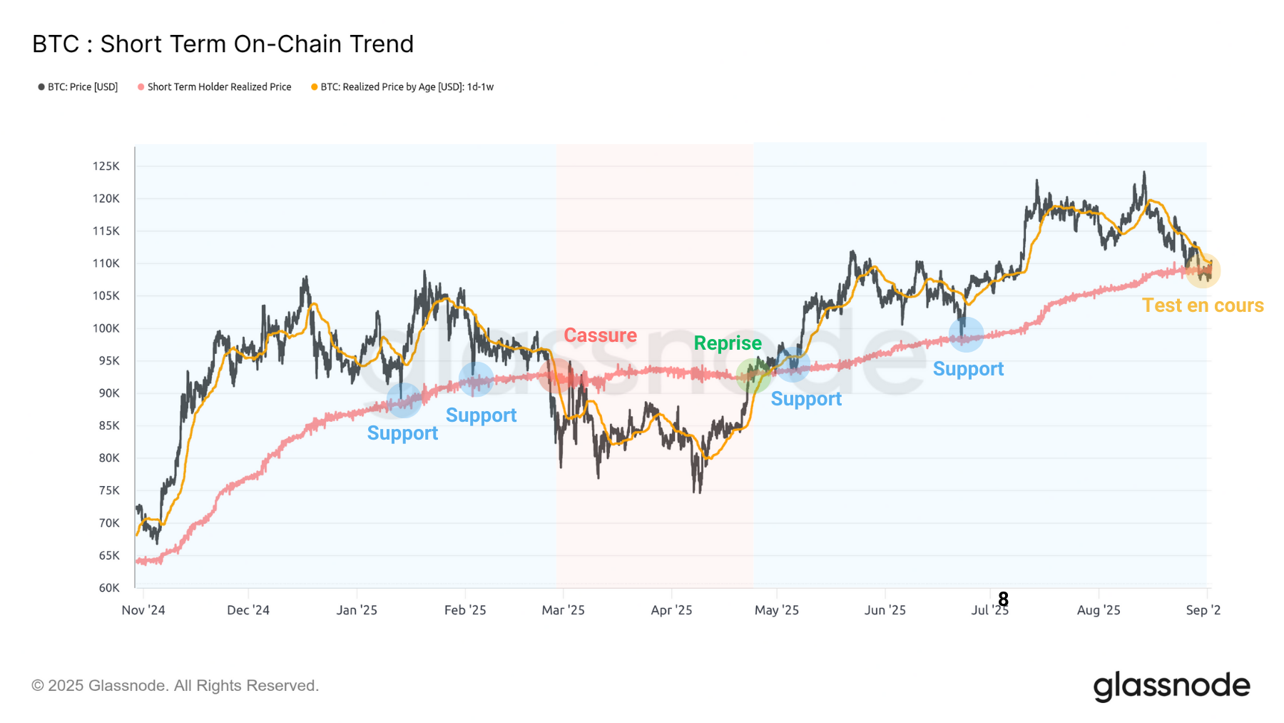 Le prix du BTC a réintégré le range de mai-juin, une zone d'accumulation importante, situé entre 110 000 $ et 100 000 $. Il évolue également autour du prix réalisé des investisseurs à court terme, situé à 108 000 $, depuis quelques jours. La direction à court terme reste incertaine, bien que le prix tienne bon pour le moment.