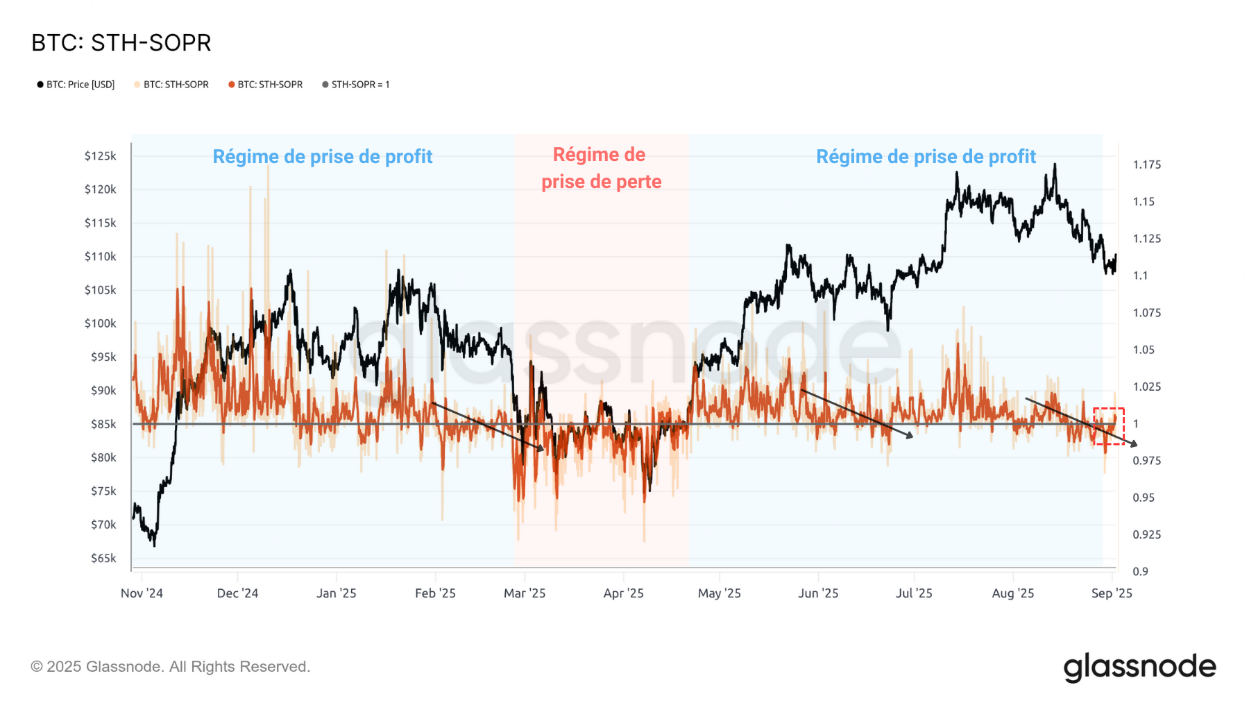Le comportement des investisseurs à court terme indique l'installation progressive d'un régime de prise de perte. En effet, le STH-SOPR a transité sous 1 la semaine passée et parvient à se maintenir en territoire baissier, suggérant que les derniers entrants réagissent au contexte actuel en vendant leurs avoirs à perte.