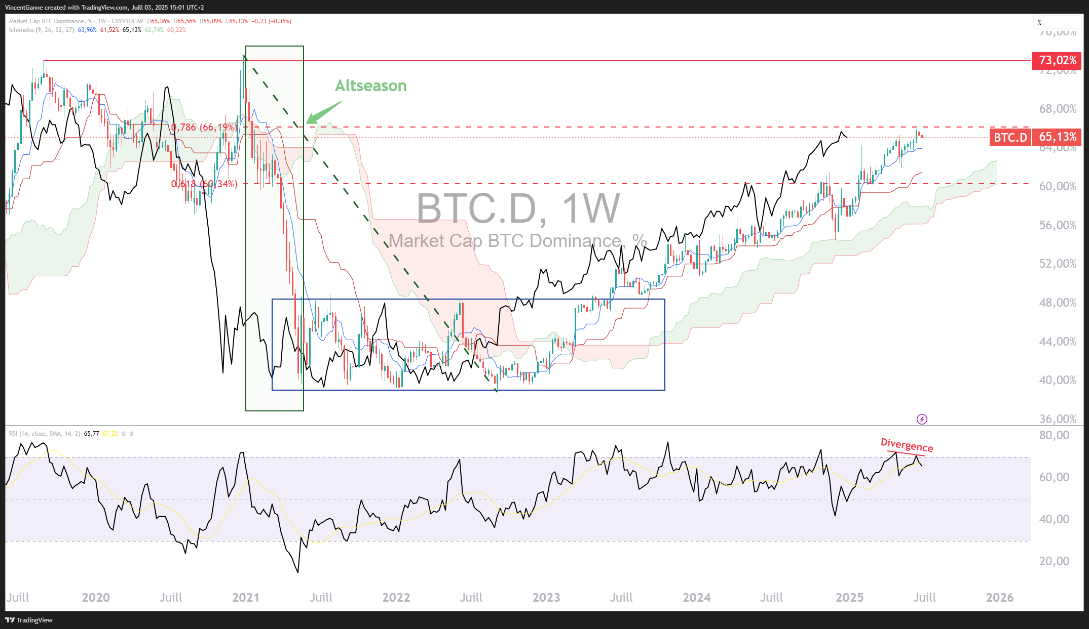 2) Dominance du Bitcoin : une divergence baissière qui se profile