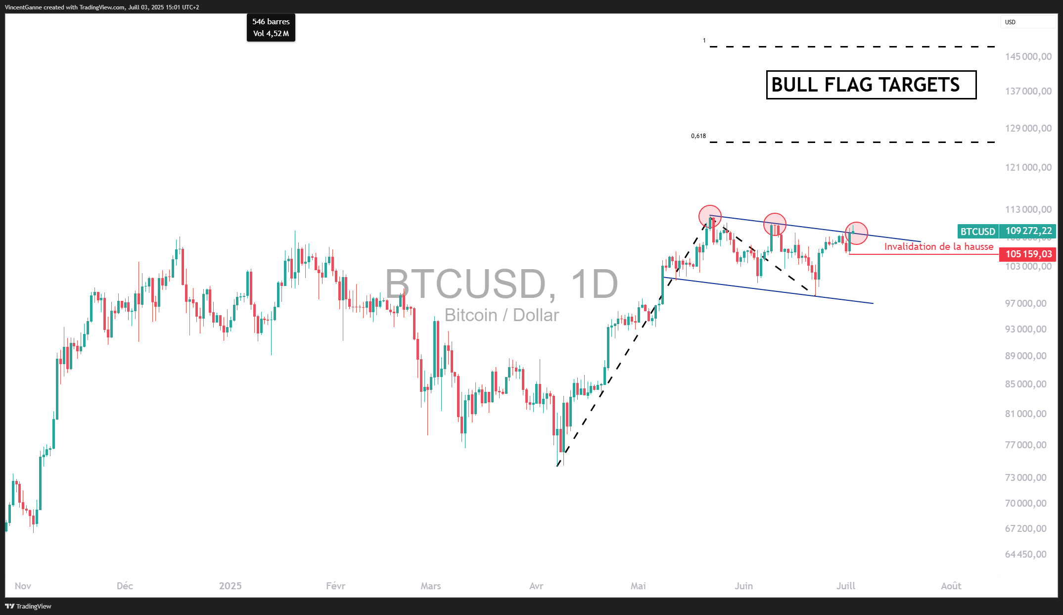 1) Bitcoin : une figure de continuation haussière dont il faut sortir pour rester haussier