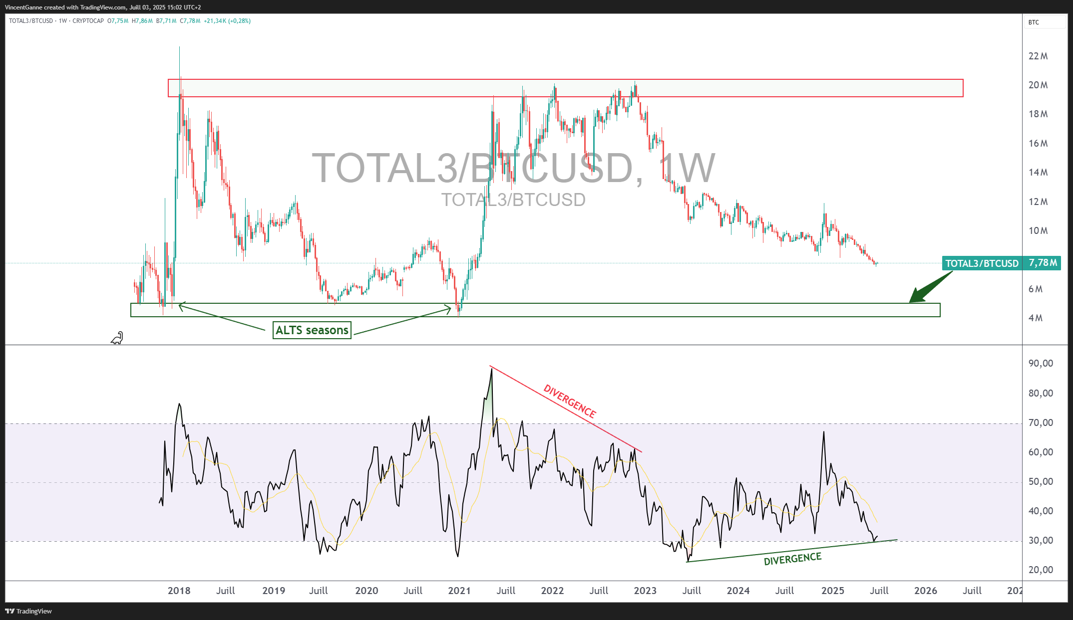 Enfin, le ratio entre les altcoins (mesurés via l’indice TOTAL3) et le BTC est également porteur d’un signal encourageant. Une divergence haussière semble en formation sur ce ratio, et une confirmation par le franchissement d’une résistance technique clé ouvrirait la voie à un rebond plus marqué des altcoins par rapport au Bitcoin.