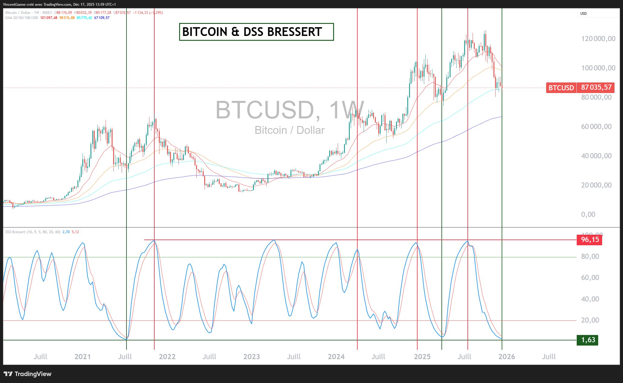 Le premier élément provient de l’analyse technique, à travers le DSS Bressert en unité hebdomadaire. Historiquement, cet oscillateur cyclique a montré une bonne capacité à identifier des phases d’excès, aussi bien à la hausse qu’à la baisse. À l’heure actuelle, le DSS évolue en zone de survente profonde, à des niveaux comparables à ceux observés lors de précédents points bas intermédiaires.