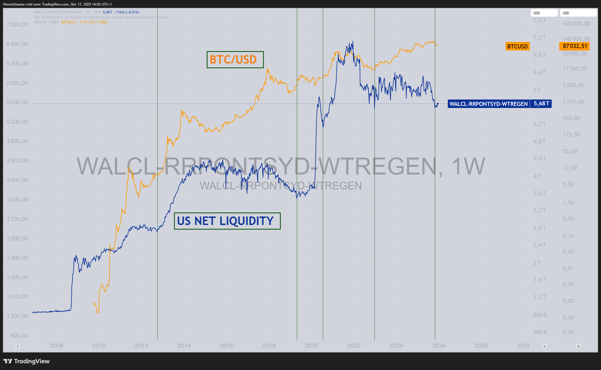 Même en l’absence d’un QE classique, l’arrêt de la détérioration marginale de la liquidité constitue souvent un catalyseur suffisant pour favoriser les actifs à bêta élevé, comme le Bitcoin. Historiquement, ce dernier réagit moins au niveau absolu de liquidité qu’à son changement de direction. Un passage d’une dynamique négative à neutre, voire légèrement positive, peut donc suffire à déclencher un mouvement de reprise du cours du bitcoin.
