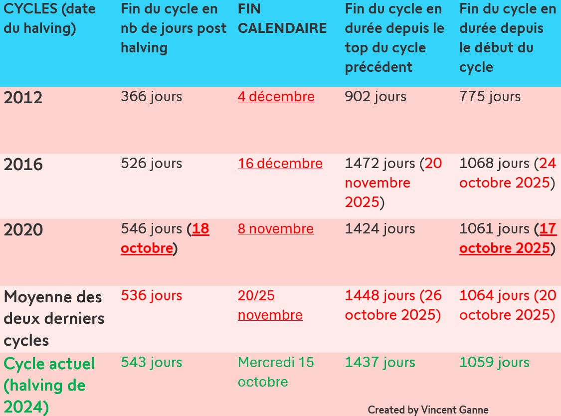 En appliquant cette chronologie au cycle actuel, ces repères correspondent respectivement au samedi 18 octobre 2025 pour les 546 jours post-halving et au vendredi 17 octobre 2025 pour les 1061 jours en durée totale.