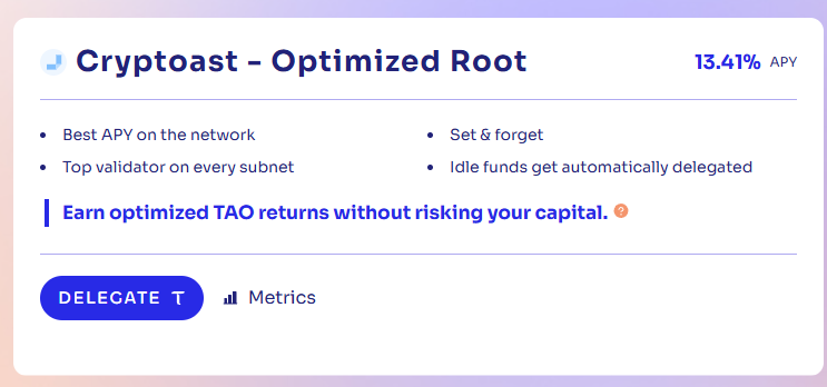Dans le but d'accroître la qualité du réseau, Bittensor offre la possibilité à tous les détenteurs de TAO de déléguer leurs tokens à un validateur. De cette façon, ceux-ci participent également au bon fonctionnement du réseau et reçoivent donc un revenu passif proportionnel à leur quantité de tokens TAO délégués. À l'heure de l'écriture de ces lignes (29 octobre 2025), le rendement sur le staking de TAO sur Bittensor peut rapporter jusqu'à 7,60 % annualisé avec une stratégie sans risque de perte de TAO.