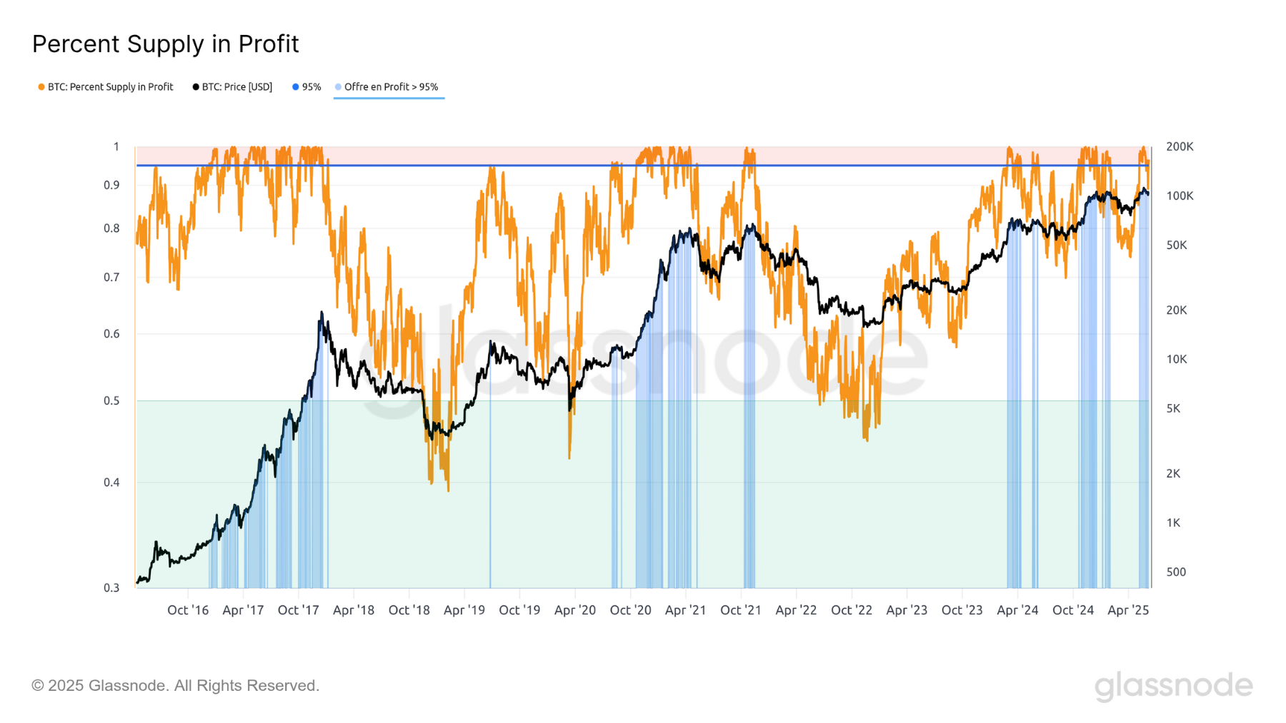 Une métrique phare permettant d'identifier les sommets de marché haussier est le pourcentage d'offre en profit, qui mesure la portion de l'offre en circulation qui est détenue au-dessus de son prix d'achat.