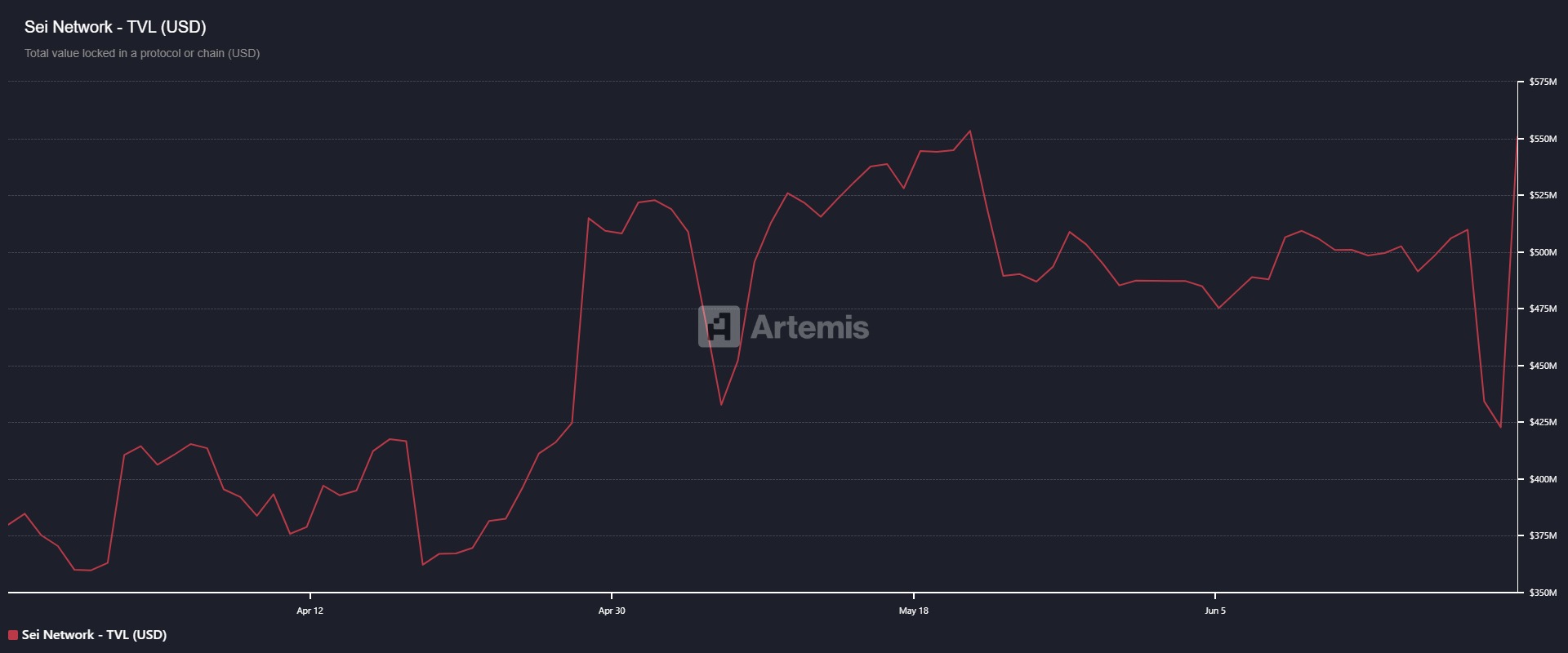C'est plutôt logique lorsque l'on considère la performance de la crypto SEI, qui mécaniquement entraîne une hausse de la valeur, mais tout de même important à observer. Par exemple, si nous avions pu observer une augmentation du prix du SEI mais une diminution de sa TVL, cela suggérerait une prise de profit des détenteurs de la crypto.