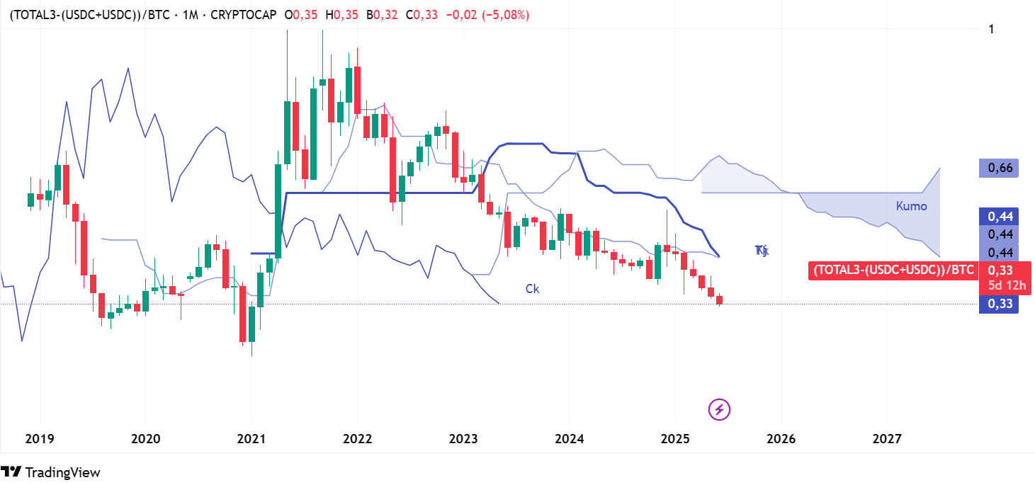 Graphique du Total 3 par rapport au BTC, en données mensuelles