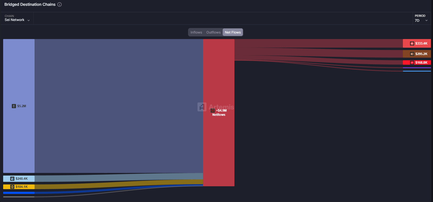Une autre métrique importante à observer : les flux de capitaux entrants/sortants (inflows/outflows) de la blockchain Sei via les bridges.