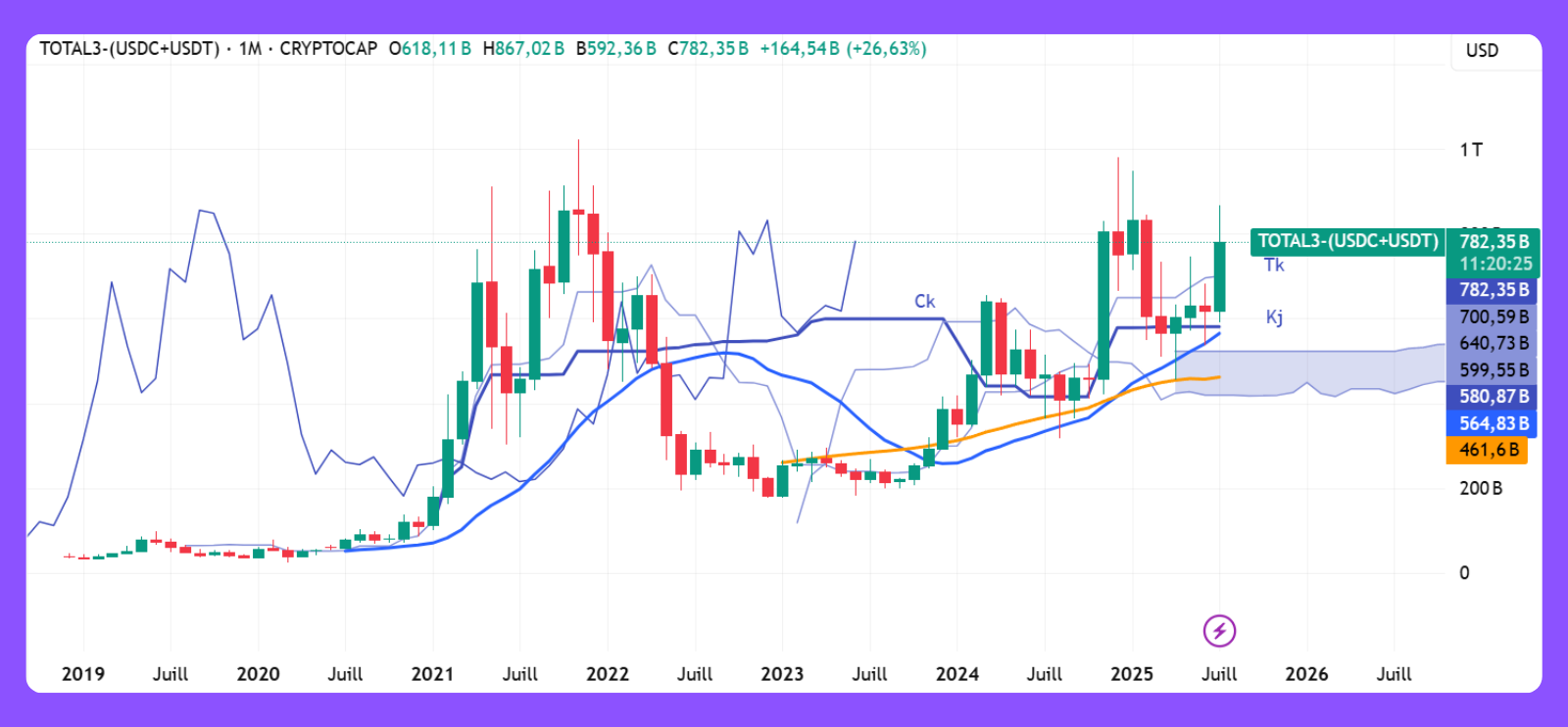 L'indice du Total 3 exclu par défaut les capitalisations du BTC et de l'Ether. Nous utilisons un indice Total 3 affiné qui exclu également les capitalisations des 2 principaux stablecoins que sont l'USDT et l'USDC.