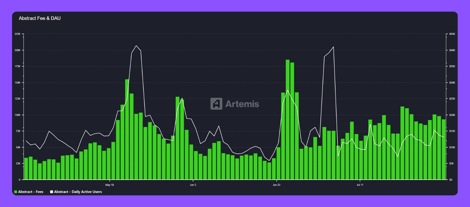 À titre d'exemple, 60 500 utilisateurs quotidiens (en moyenne) ont été recensés au cours de la semaine du 14 au 21 juillet. Bien que ce chiffre peut sembler faible face à des blockchains multi usages comme Base ou Arbitrum (avec respectivement 1,2 million et 333 300 utilisateurs) , il reflète au contraire une utilisation intense d'Abstract par rapport à son nombre d'applications actuelles.