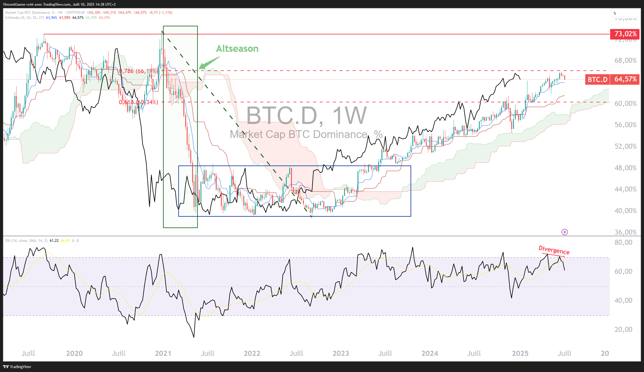 Les 2 graphiques que je vous présente ci-dessous mettent en évidence des pré-signaux techniques qui sont baissiers pour la dominance du BTC. Attention, ces signaux baissiers ne sont pas encore validés, alors il ne faut pas mettre la charrue avant les bœufs.