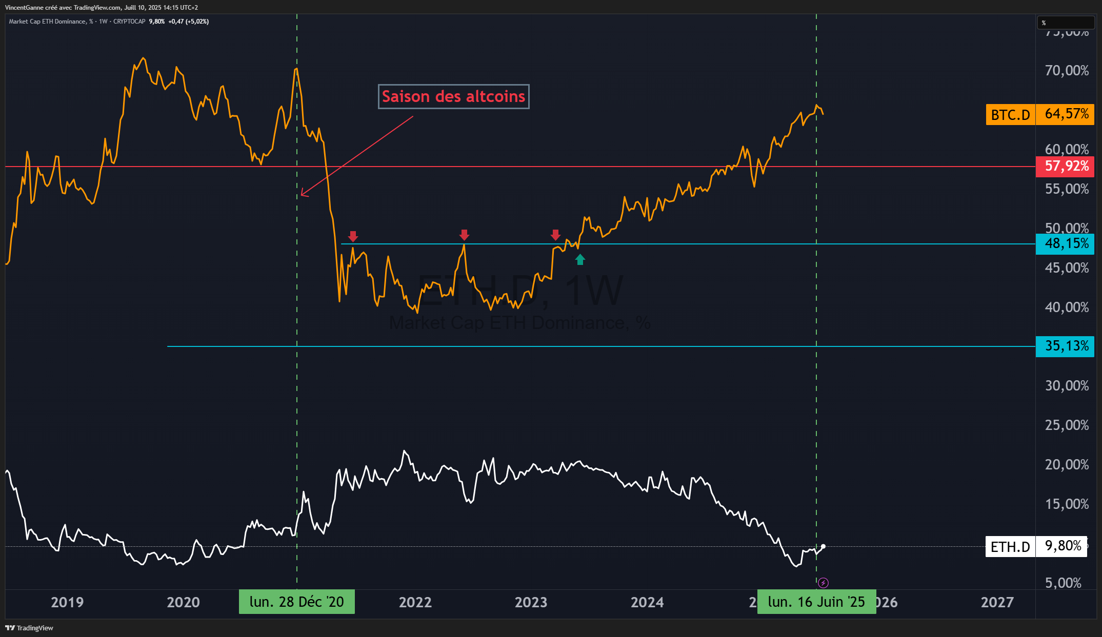 - Le second graphique met en parallèle la dominance de l'Ether (en blanc) et celle du Bitcoin (en orange). La première rebondit sur un niveau de support majeur historique et la seconde semble donc présenter un début de divergence baissière dans une zone historique assez haute.