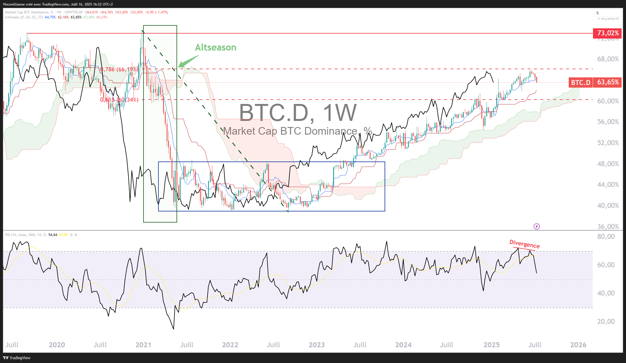 L’évolution de la dominance du Bitcoin est l’un des indicateurs les plus surveillés. Depuis plusieurs semaines, une divergence baissière s’est formée entre la trajectoire des prix et celle du momentum, ici mesuré par l’indicateur RSI. Si cette configuration venait à se confirmer, elle signalerait un affaiblissement de la domination du BTC, ce qui peut implicitement signifier le point de départ de la saison des altcoins.