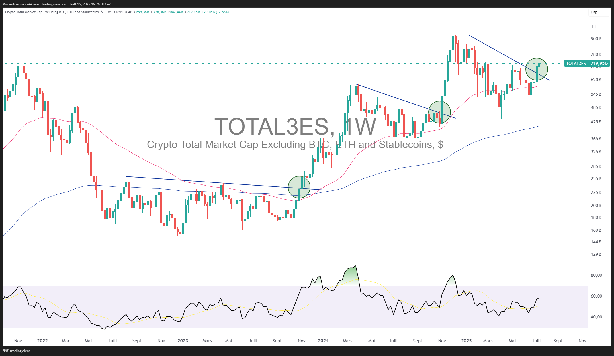 En observant la capitalisation globale des cryptomonnaies après exclusion des plus grandes capitalisations, un signal graphique positif est apparu récemment. La rupture d’une résistance majeure en données hebdomadaires valide une configuration haussière qui, si elle se prolonge, pourrait soutenir l’appréciation des altcoins jusqu’à la fin du cycle.