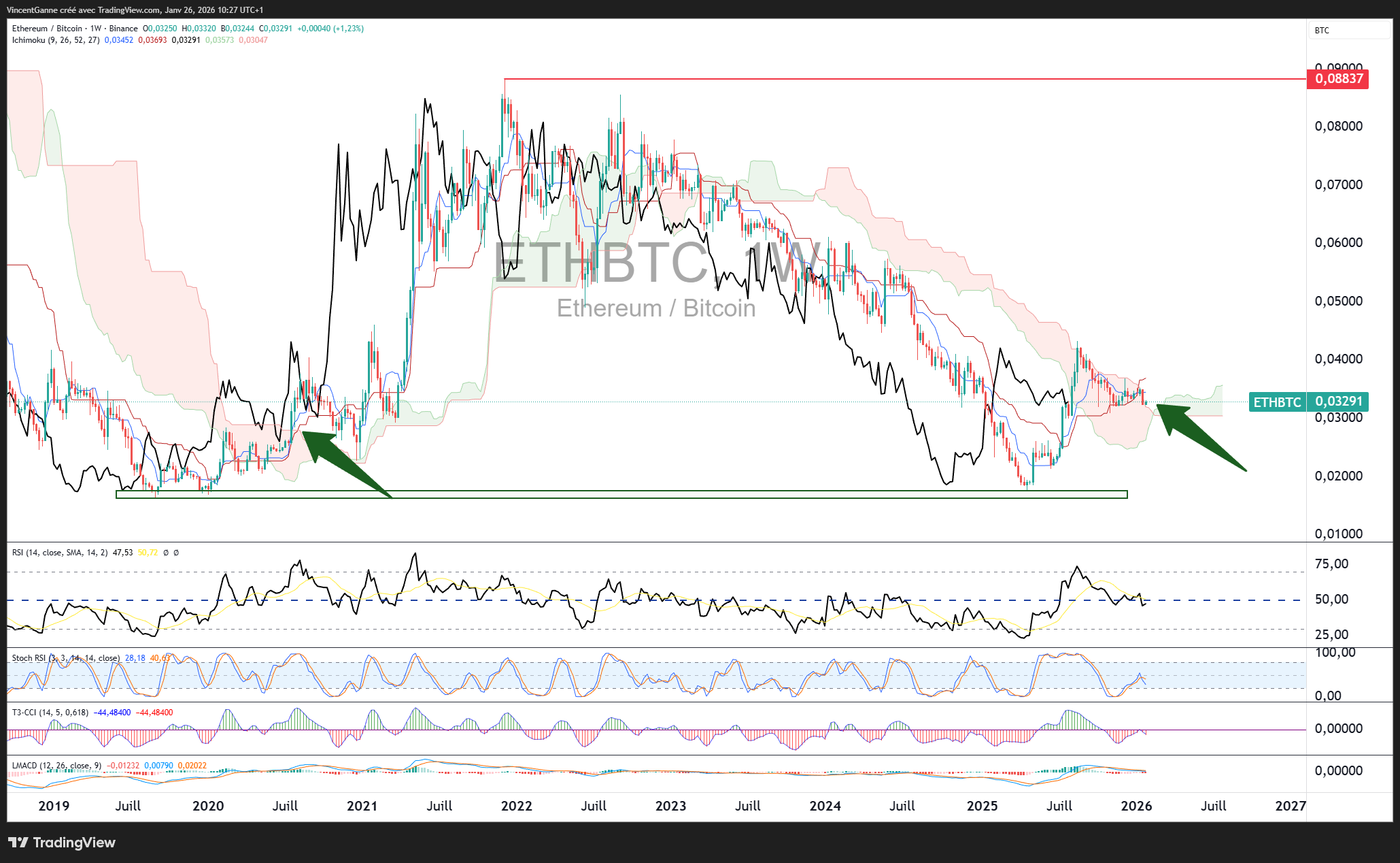 En données hebdomadaires, le ratio ETH/BTC évolue depuis plusieurs mois à l'intérieur du nuage Ichimoku, après avoir réagi sur une zone de support de long terme particulièrement importante. Cette zone correspond à un niveau historiquement défendu à plusieurs reprises depuis 2019, ce qui renforce sa pertinence technique. On est clairement sur un support extrême de cycle.