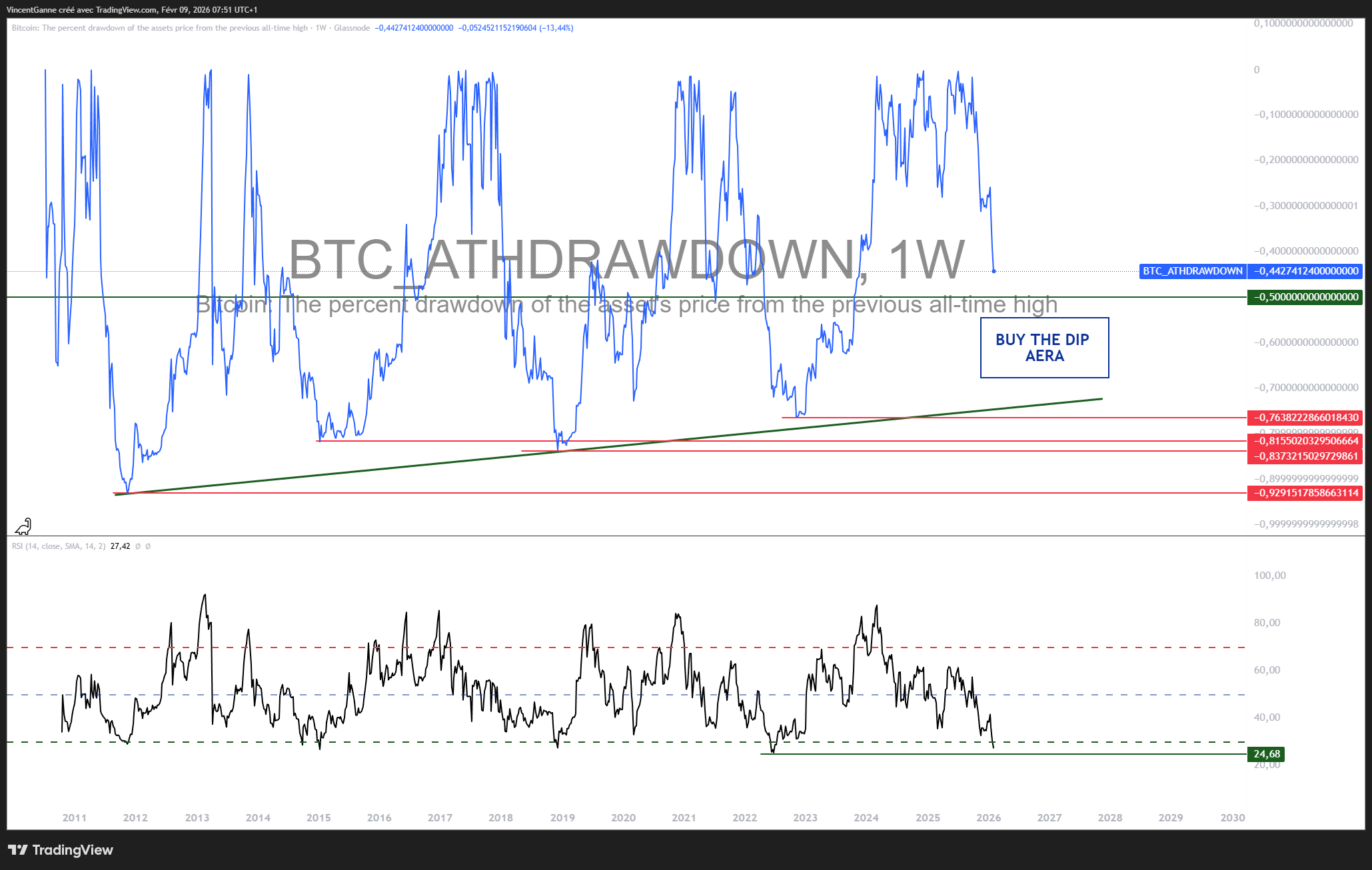 Appliqué au bitcoin, le DCA prend tout son sens dans les phases de drawdown avancé, lorsque le pessimisme est dominant et que les indicateurs de long terme sont arrivés en zone de survente technique. Historiquement, les zones comprises entre –50 % et –70 % de drawdown par rapport au sommet précédent ont souvent constitué des zones d’accumulation très favorables pour les investisseurs patients.