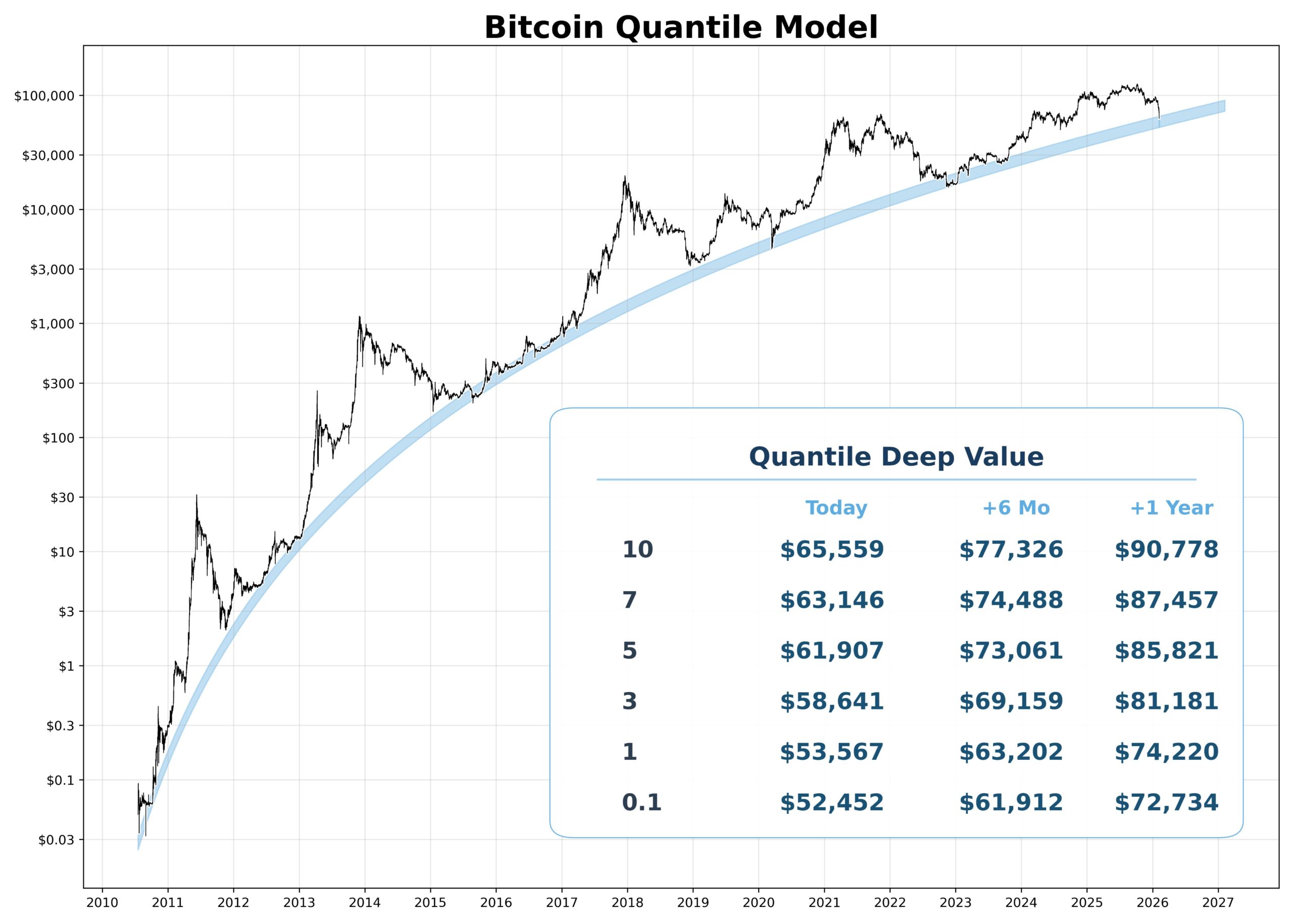 Rien ne permet de dire que le point bas la semaine dernière à 60 000 dollars  est le point bas final du bear market et il est tout à fait possible que ce niveau soit revisité ces prochains mois. Par contre, la plupart des modèles de prévision du BTC sur le long terme, comme le modèle Quantile basé sur la loi de puissance (power law), décrivent la zone de 50 000 / 60 000 dollars comme une zone où une stratégie de DCA a une probabilité élevée d'être gagnante sur le long terme.