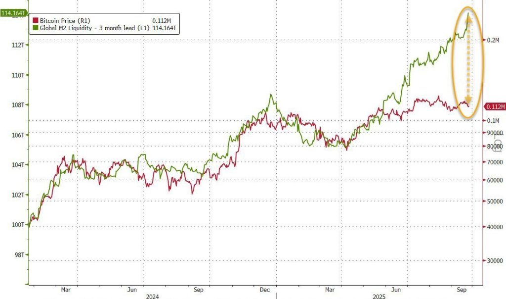 En résumé, la fin du remplissage du TGA, attendue au début du mois d’octobre, pourrait marquer un tournant : le retour de liquidité vers l’économie mondiale soutiendrait les actifs risqués, et le bitcoin pourrait en profiter pour reprendre une trajectoire haussière et se réaligner sur le niveau de la liquidité mondiale M2.