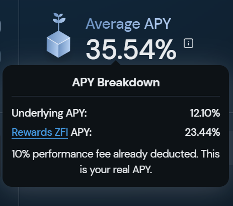 À l'écriture de ces lignes, le rendement moyen annuel (APY) offert par ZyFAI est de 35,54 %. Cette prouesse est rendue possible grâce à l'introduction du rZFI (dont nous détaillerons le fonctionnement).
