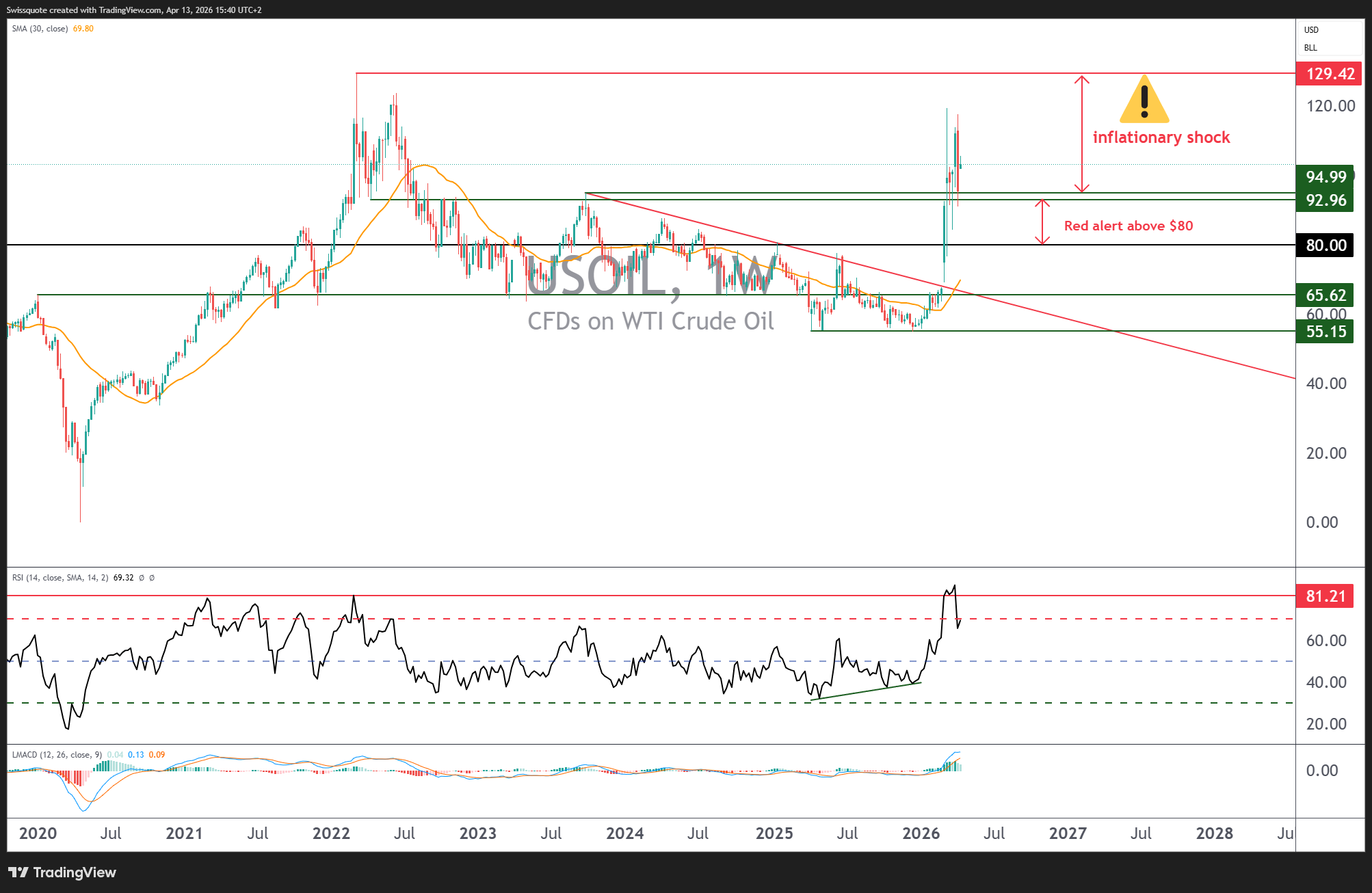 J'estime que ces deux baromètres sont les deux plus tangibles pour évaluer de manière concrète si la situation géopolitique & macro-économique s'apaise ou au contraire reste très compliquée. Le graphique ci-dessous dévoile les bougies japonaises en données hebdomadaires du pétrole brut US (WTI).