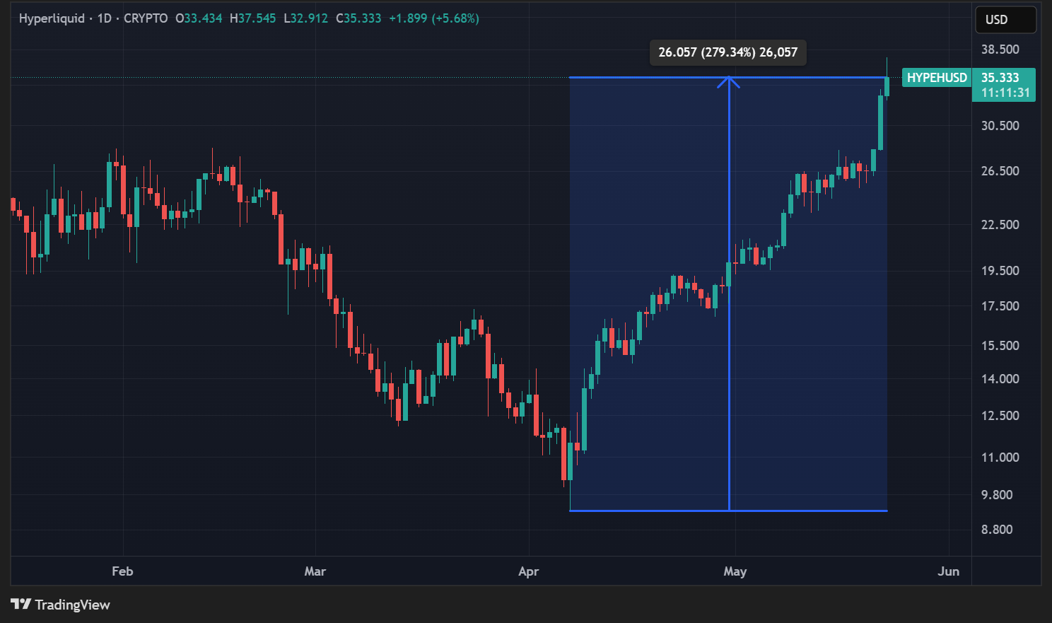 Après un plus bas annuel à 9,33 dollars le 7 avril dernier, le prix du token HYPE affiche maintenant 35,33 dollars, soit une hausse de près de 280 % en moins de 2 mois :