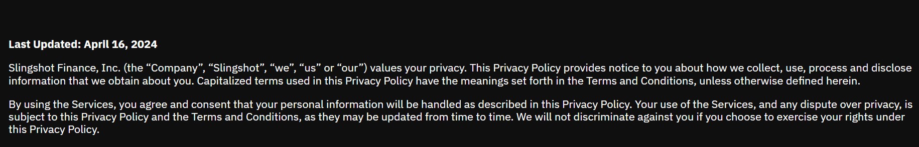 Et pour cause, la politique de confidentialité et les conditions d’utilisation renvoient toutes deux vers un nom de domaine appartenant à une entreprise nommée Slingshot Finance. Cette société crypto aurait été fondée en 2020 et ne semble pas avoir de lien particulier avec Donald Trump, alors que ce dernier affichait encore son crypto-scepticisme à l’époque.