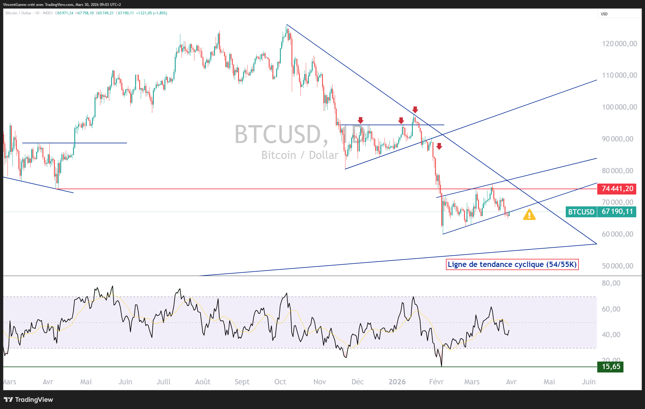 La sortie baissière est-elle acquise à 100% ? La réponse est nuancée. Sur le plan purement graphique, elle semble ne faire aucun doute, surtout que le BTC se situe actuellement dans son marché baissier cyclique sur le plan temporel.