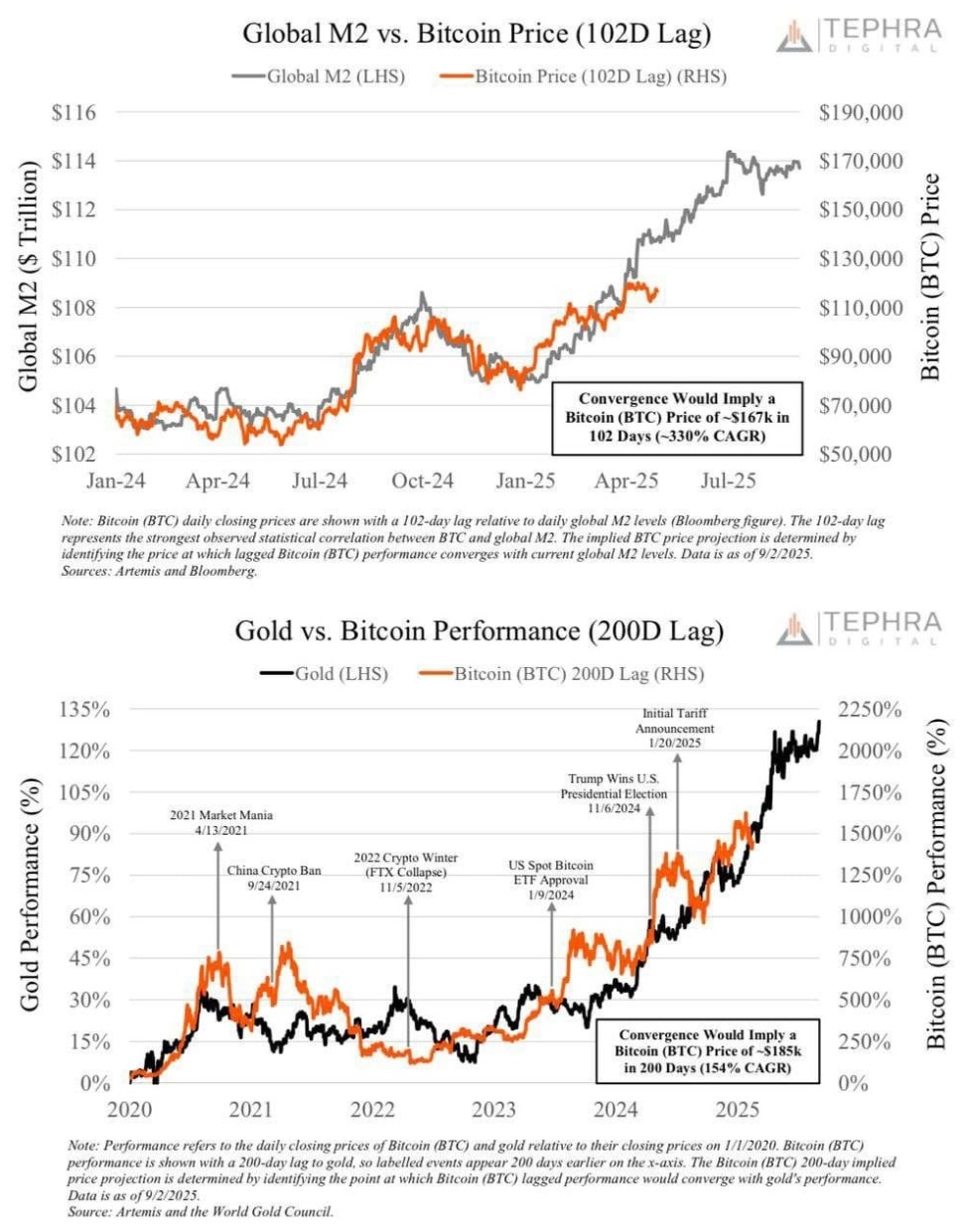 Les données récentes montrent une corrélation marquée entre le Bitcoin, la masse monétaire mondiale (M2) et l’or. En observant l’évolution du M2 avec un décalage de 102 jours, le modèle suggère que la trajectoire actuelle du Bitcoin pourrait le conduire vers des niveaux proches de 167 000 dollars d’ici janvier 2026, prolongeant ainsi le cycle au-delà de la mi-octobre 2025.