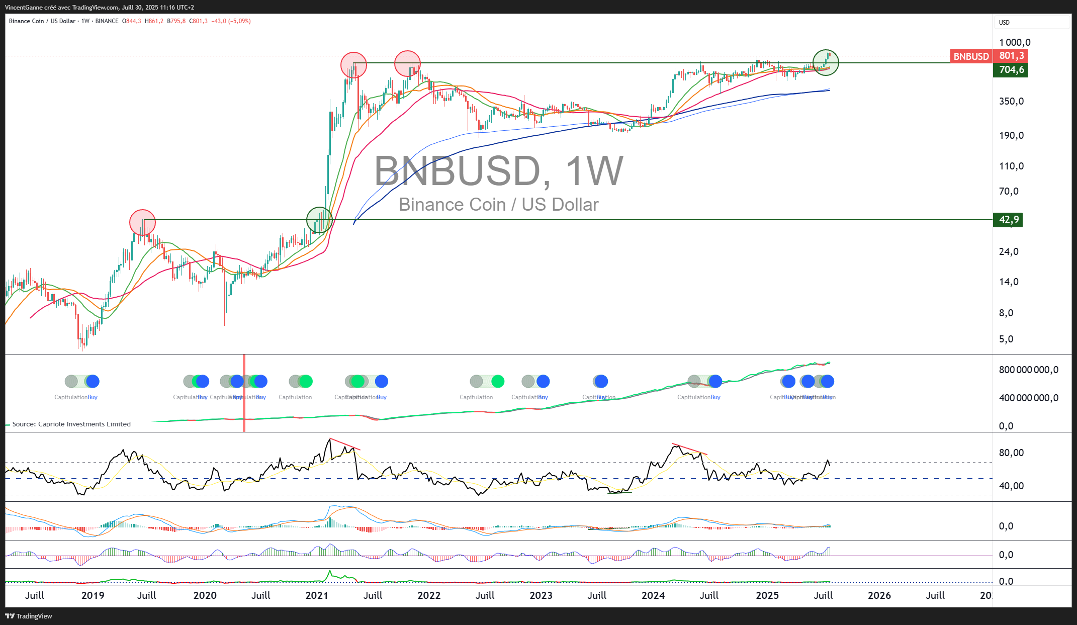 Le cours du BNB/USD vient de réaliser une cassure technique haussière du record du précédent cycle, c’est un signal puissant de continuation haussière qui donne un message favorable pour les altcoins jusqu’à la fin du cycle.