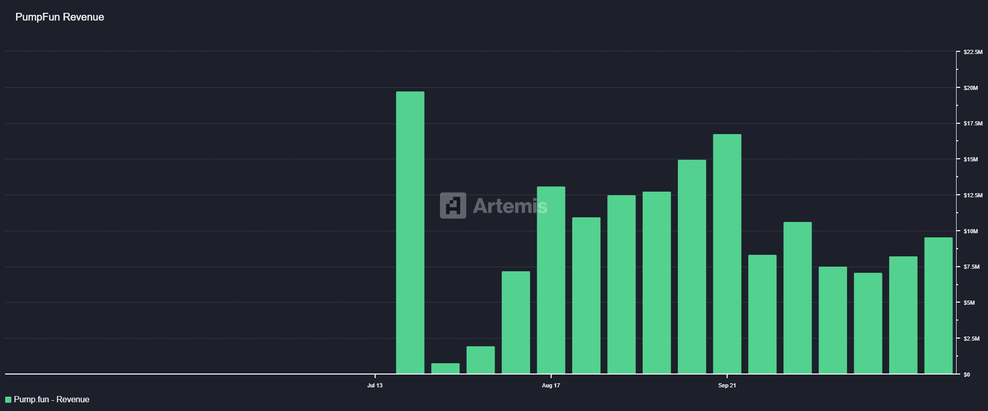 En effet, Pump.fun possède un business model qui semble résister à la cyclicité de l'attention, et de la spéculation intrinsèque à l'écosystème crypto. Sur la période du 25 septembre au 25 octobre, Pump.fun a généré 37,7 millions de dollars de revenues selon les données d'Artemis.