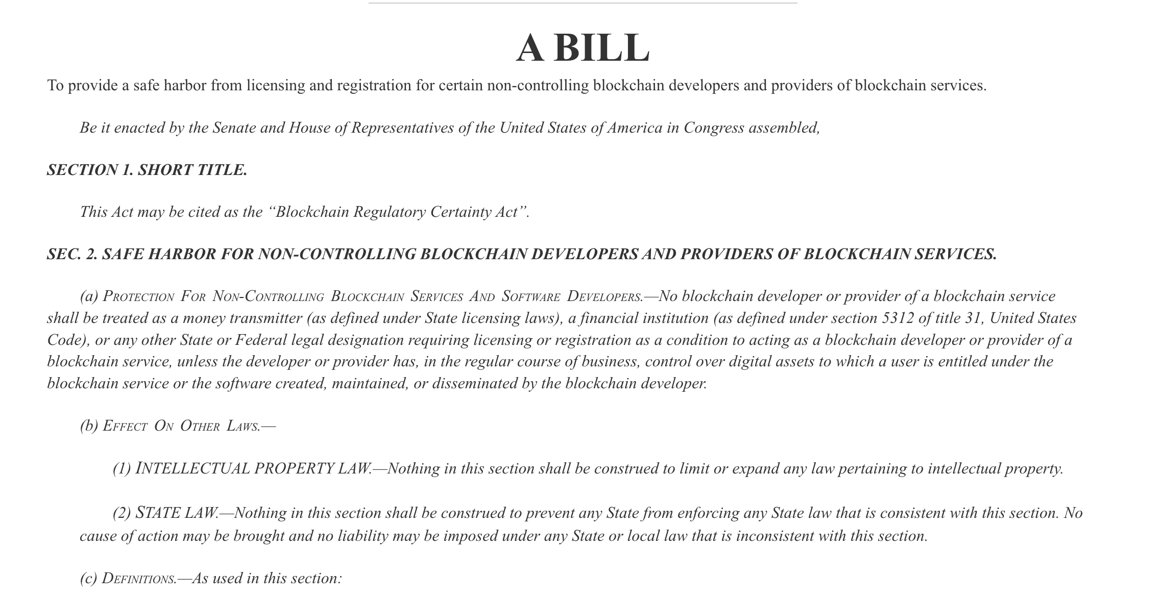 À la fin du mois de mai 2025, les représentants Tom Emmer (Républicain) et Ritchie Torres (Démocrate) ont proposé une nouvelle loi visant à protéger les développeurs de protocoles non-custodials : le Blockchain Regulatory Certainty Act (BRCA).
