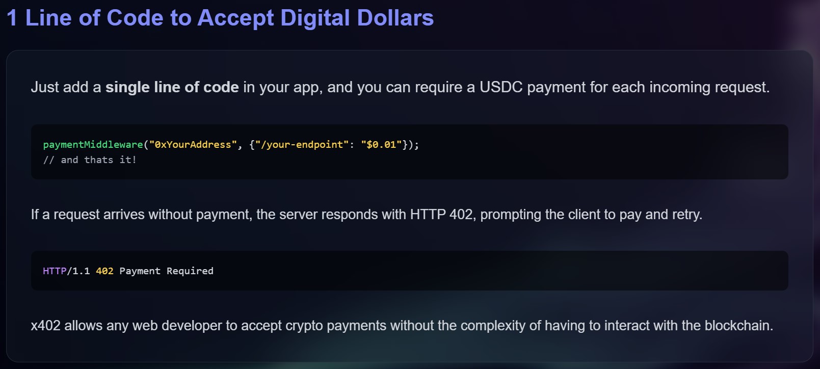 Sur le site Web dédié à cette norme, nous retrouvons un exemple illustrant de quelle manière une simple ligne de code permet le déploiement de cette nouveauté sur une application, par exemple afin de monétiser des API, des services ou du contenu :