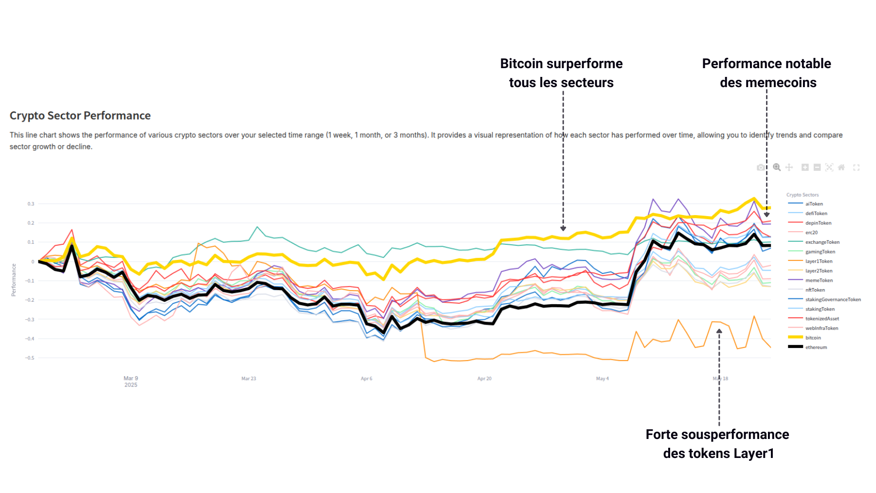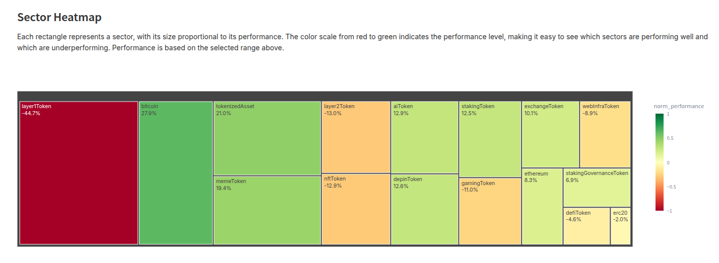 Les meilleures performances sectorielles concernent les memecoins et les actifs tokenisés, qui ont en moyenne augmenté de +20 %, tandis que les tokens liés aux protocoles de Layer 1 ont enregistré la plus forte sousperformance, d'à peu près -45 %.