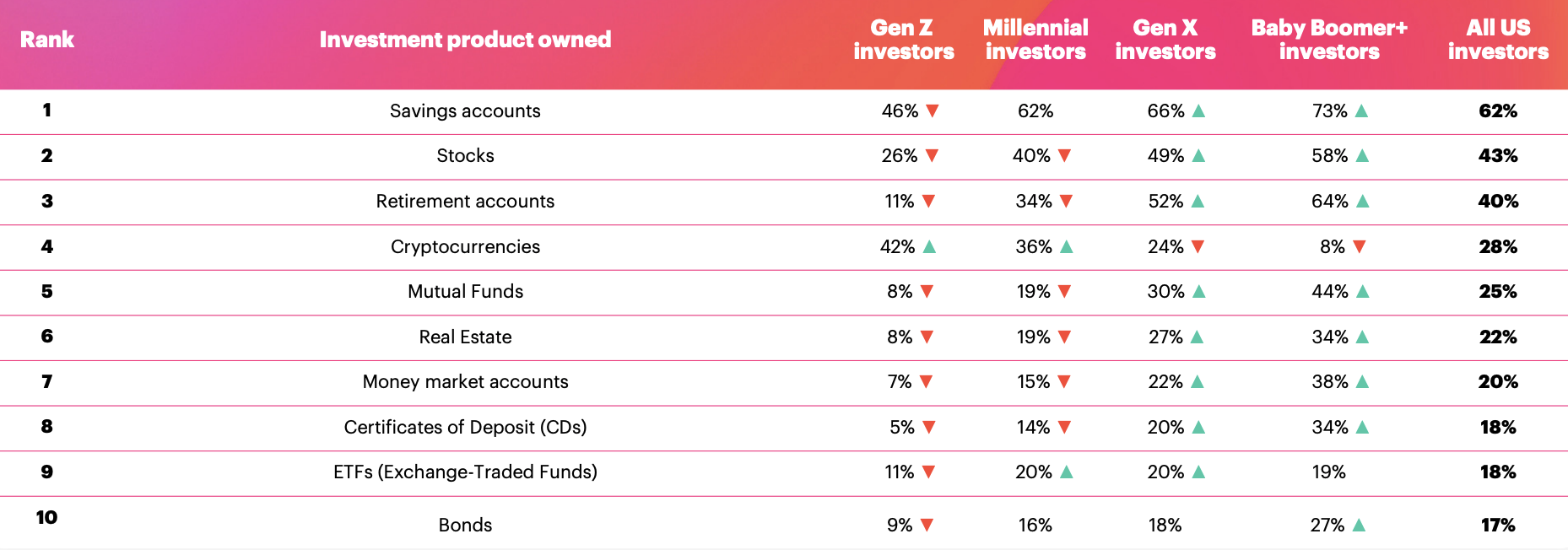 Une étude de YouGov sur les investissements démontre que la génération Z est 4 fois plus susceptible de posséder de la crypto plutôt qu'un compte d'épargne classique, soulignant un intérêt certain pour les actifs financiers à forte volatilité.