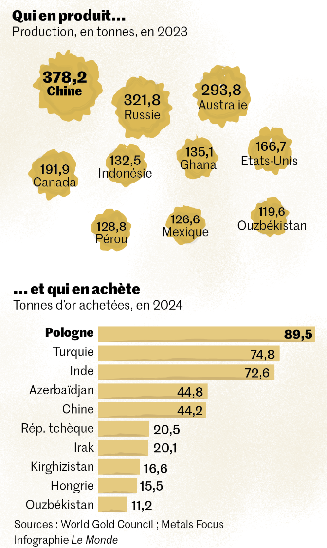 Face à cette dynamique optimiste, les banques centrales prennent soin de leurs stocks. C’est en effet 1 044 tonnes d’or qui ont été acquises en 2024 contre 473 tonnes par an en moyenne sur la décennie précédente, selon les chiffres du Conseil mondial de l’or (CMO), la fédération internationale des compagnies aurifères.
