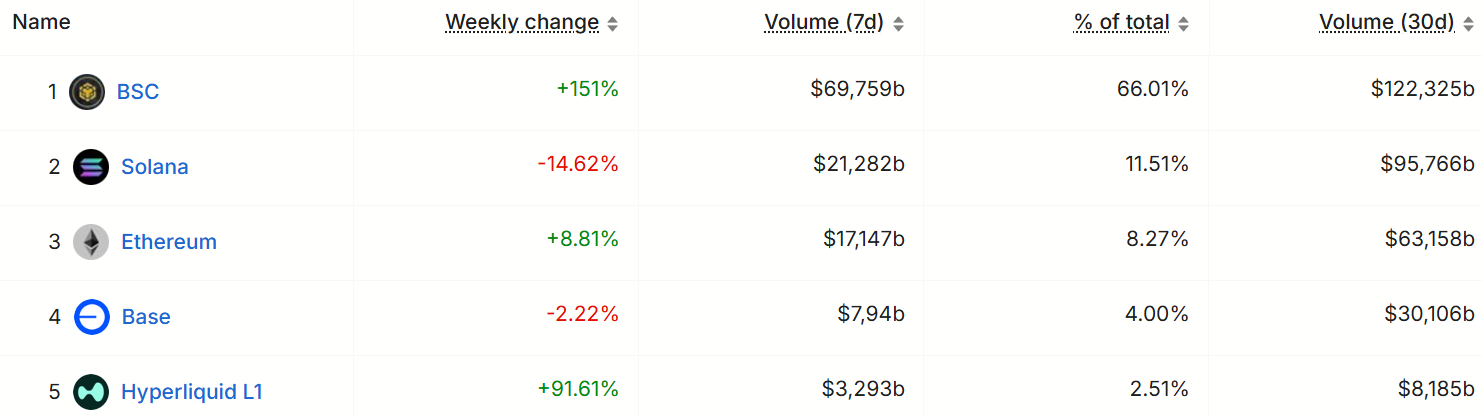En glissement hebdomadaire, la dynamique est également défavorable pour Solana avec une baisse de 14,62 % des volumes spot sur ses DEX contre une augmentation de 151 % pour la BNB Chain :
