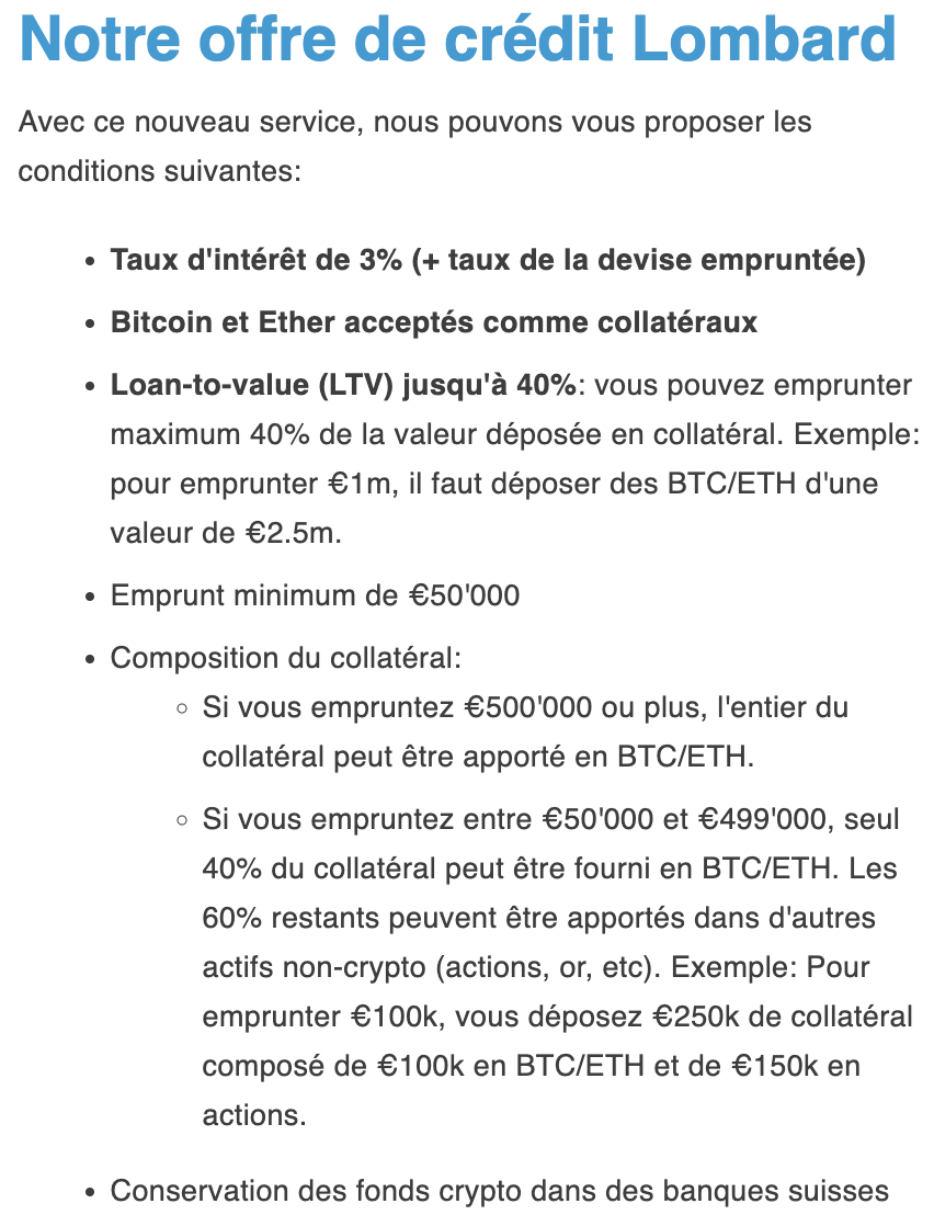 La Banque Delubac (en collaboration avec Lombardly), Swissquote et plus récemment Mt Pelerin proposent aujourd'hui des crédits Lombard contre du Bitcoin. L'offre est simple : vous déposez des cryptomonnaies en collatéral (Bitcoin, Ether, etc.), et la société vous prête de l'argent en échange. Cela entend une infrastructure centralisée et une banque qui faisait office d'intermédiaire avec des clés privées et donc les fonds détenus par une autorité et non par le client.