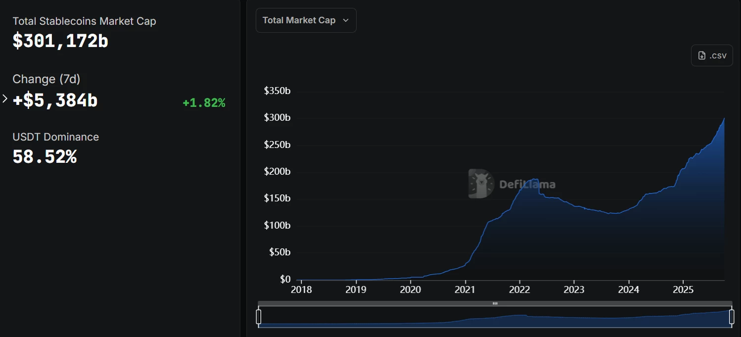 Selon les données de DeFiLlama, la capitalisation totale des stablecoins sur le marché crypto a récemment dépassé les 301 milliards de dollars, avec une progression de 6,4 % en seulement 30 jours.