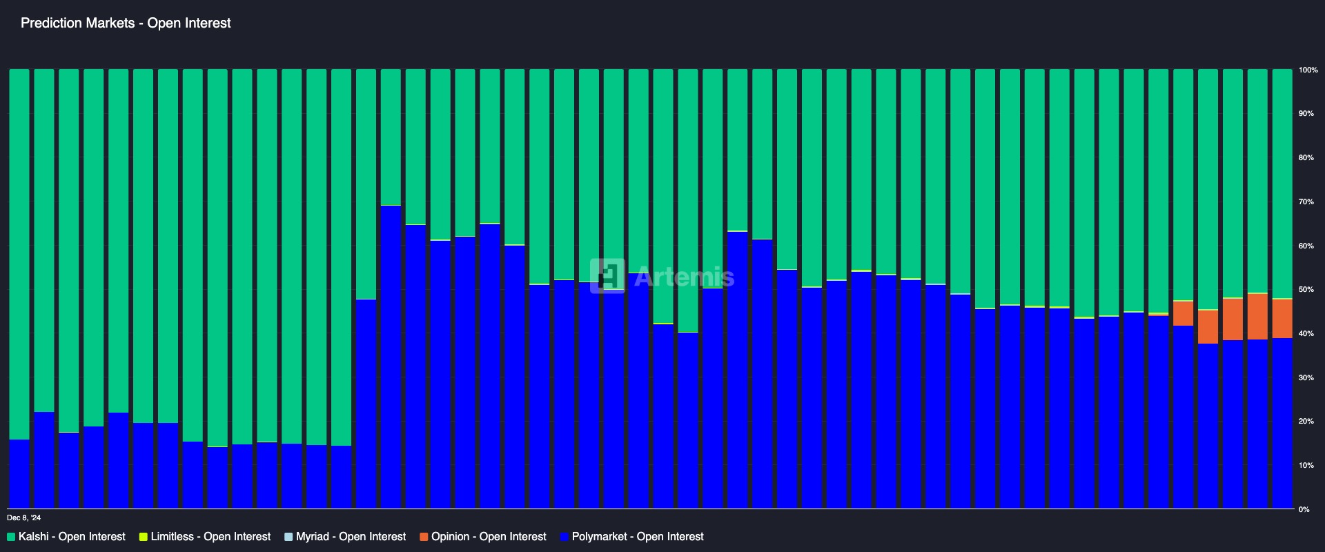 Selon les données de la plateforme d'analyse Artemis, Kalshi représente plus de 50 % de parts de marché en termes d'intérêt ouvert (open interest) sur le secteur des prediction markets. Polymarket, bien que plus populaire dans la sphère crypto, affiche pour sa part moins de 40 %, à titre indicatif.