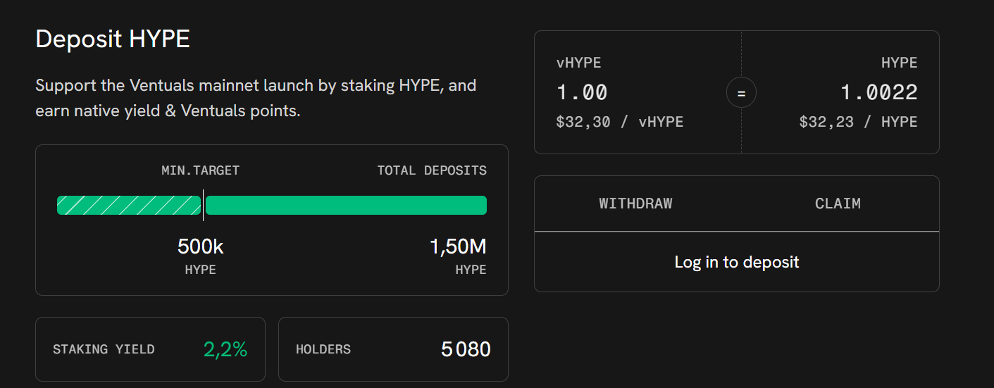 Le cœur du système d'incentives reste le staking de HYPE en vHYPE. L'utilisateur achète du HYPE directement sur Hyperliquid, puis le convertit sur Ventual. Dès lors, chaque jeton génère des points en continu, heure après heure.