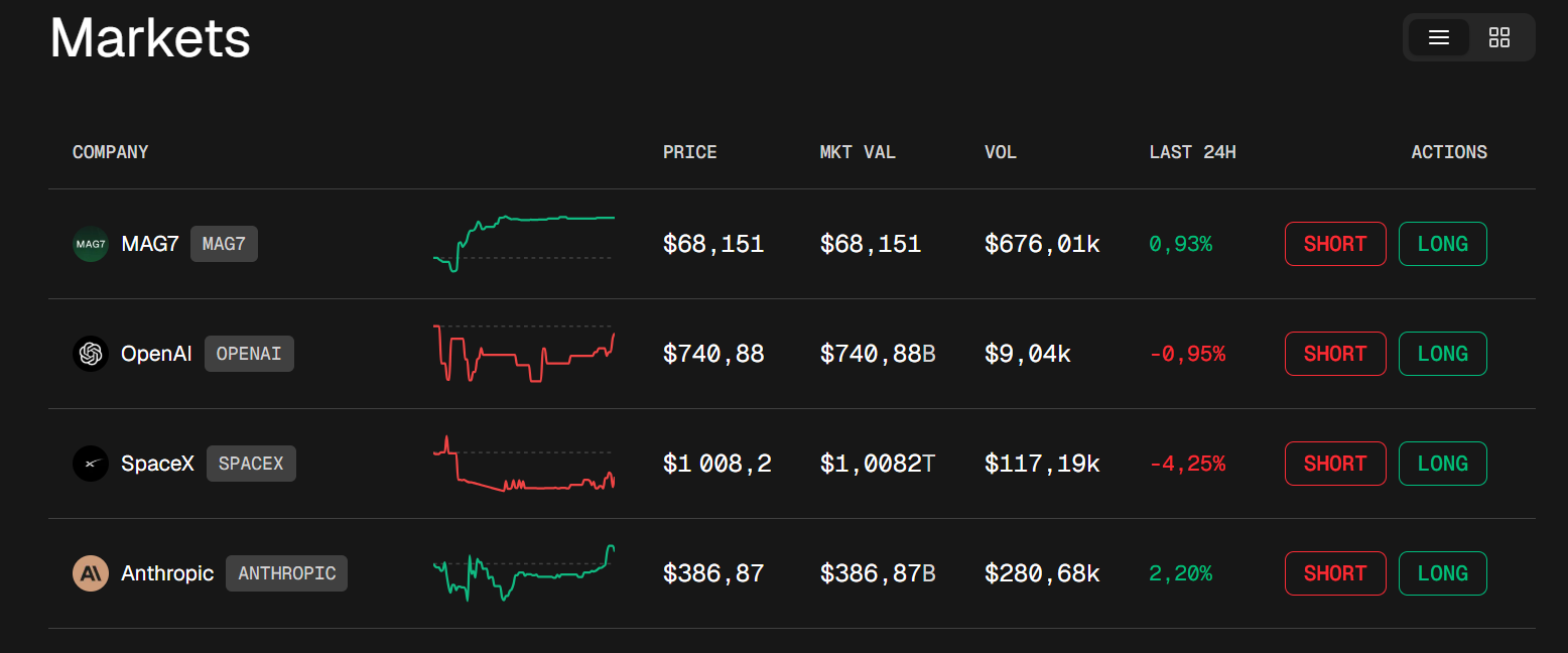 Au cœur du système, un oracle optimiste hybride fusionne des données off-chain (levées de fonds, revenus annualisés, marchés secondaires) avec l'activité on-chain pour des prix en temps réel, résistants à la manipulation et vérifiables. Ces perpetuals sont déployés via le standard HIP-3 d'Hyperliquid, qui autorise des marchés illimités sans oracles centralisés. Pas d'achat d'actions physiques : tout est synthétique, en stablecoins, avec une unité de valorisation en VU (1 VU = 1 milliard USD). Par exemple, vSPX pour SpaceX à 200 VU, ce qui équivaut à une expo sur 200 milliards de valorisation.